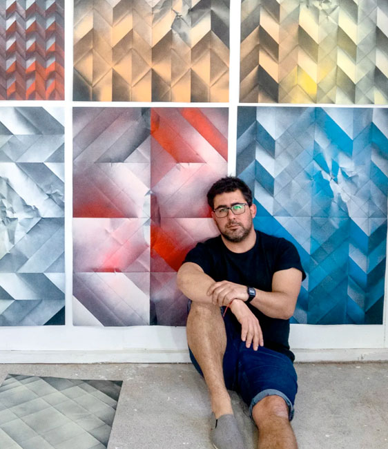 Según sus propias palabras, su trabajo tiene solamente dos variables, el papel y el spray. El papel se arruga y dobla, en ese estado se pinta, finalmente se plancha. Con este proceso, la obra transmite toda la manipulación del papel, toda su historia plasmada en un instante, como una fotografía de una forma.