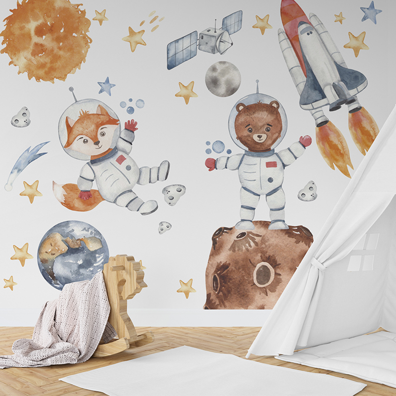 Haz que la habitación de tus pequeños se convierta en un universo de aventuras con este encantador papel mural infantil de temática espacial. Con tiernos astronautas en forma de oso y zorro, cohetes, planetas y estrellas, este diseño de acuarela es perfecto para estimular la imaginación y creatividad de los niños.